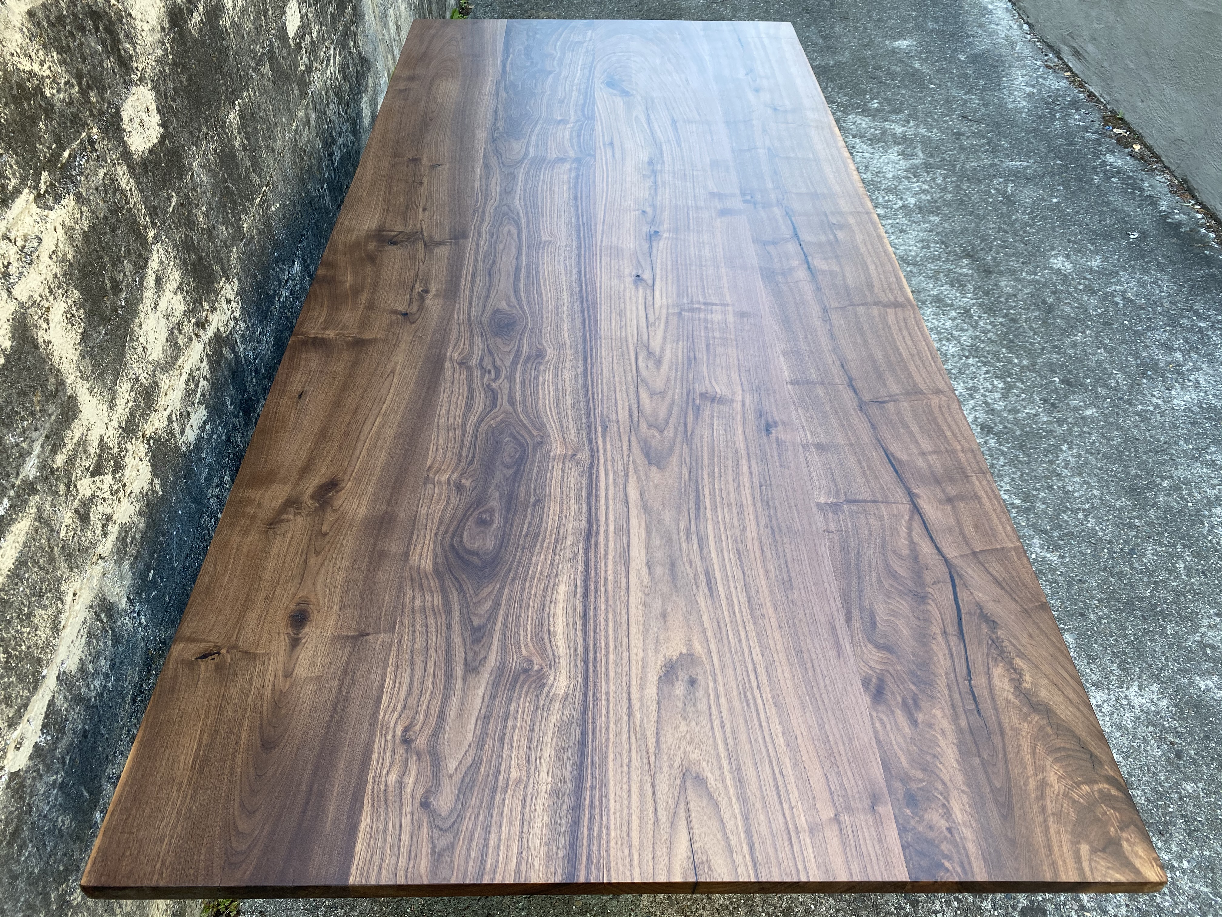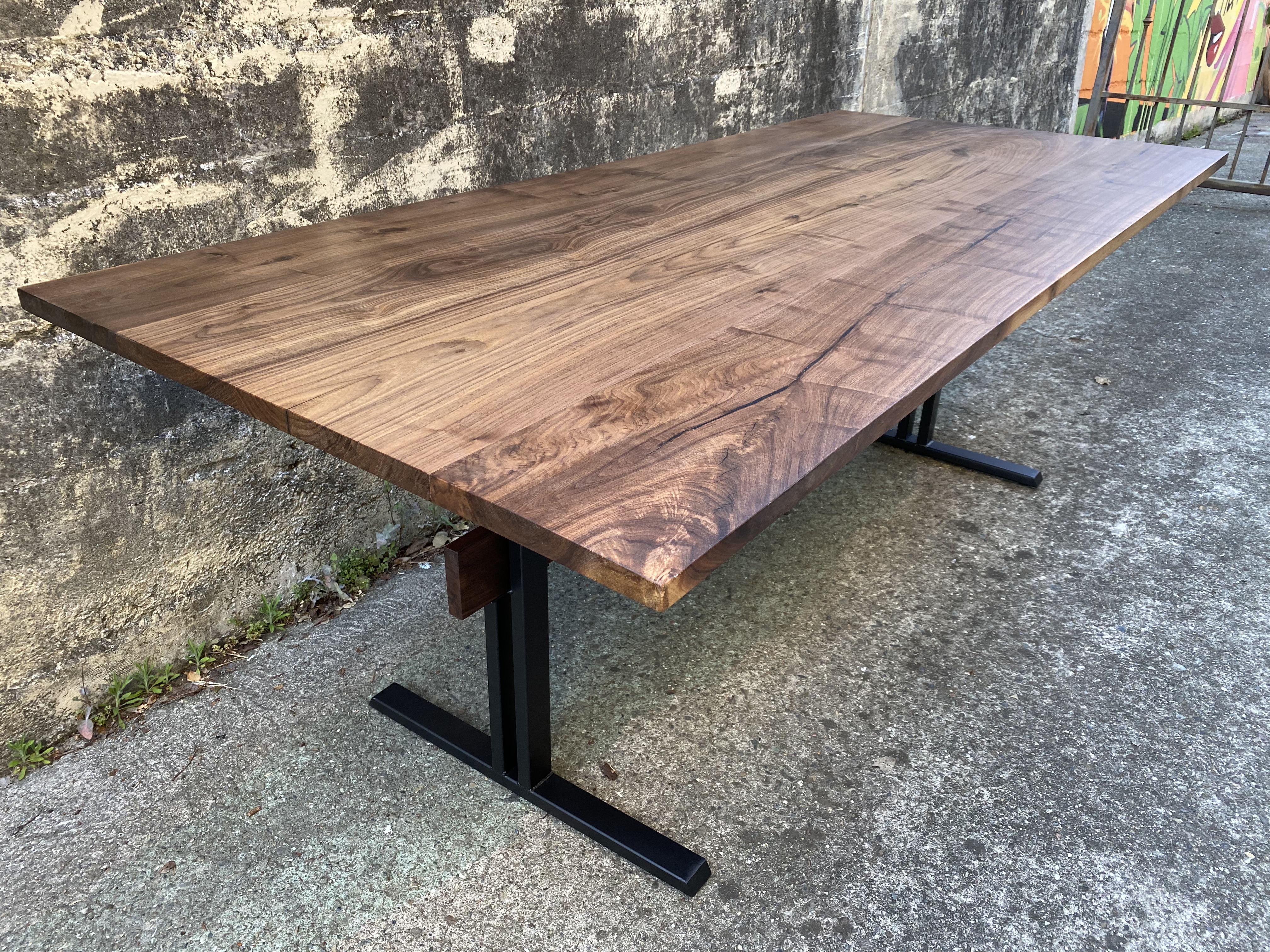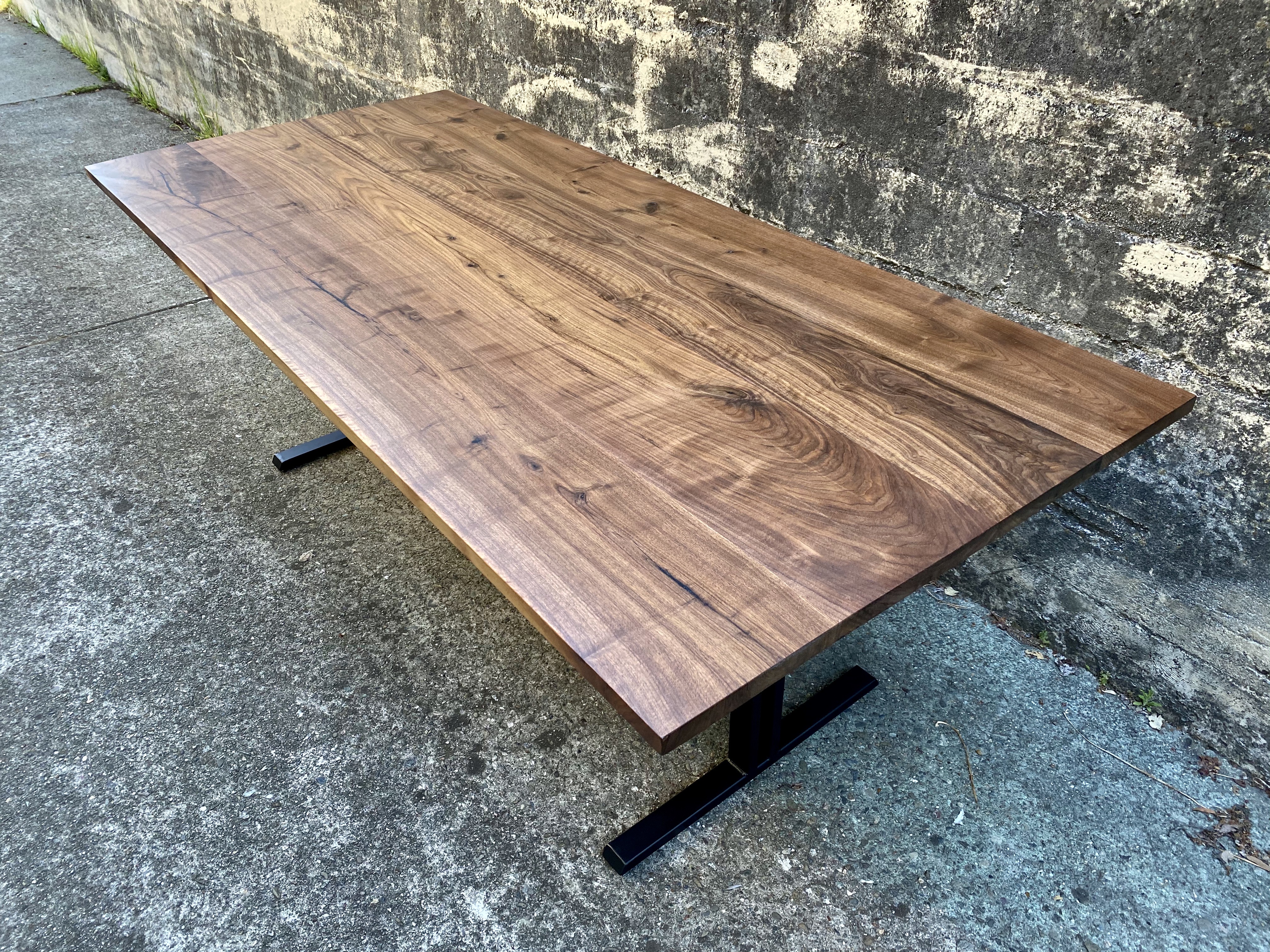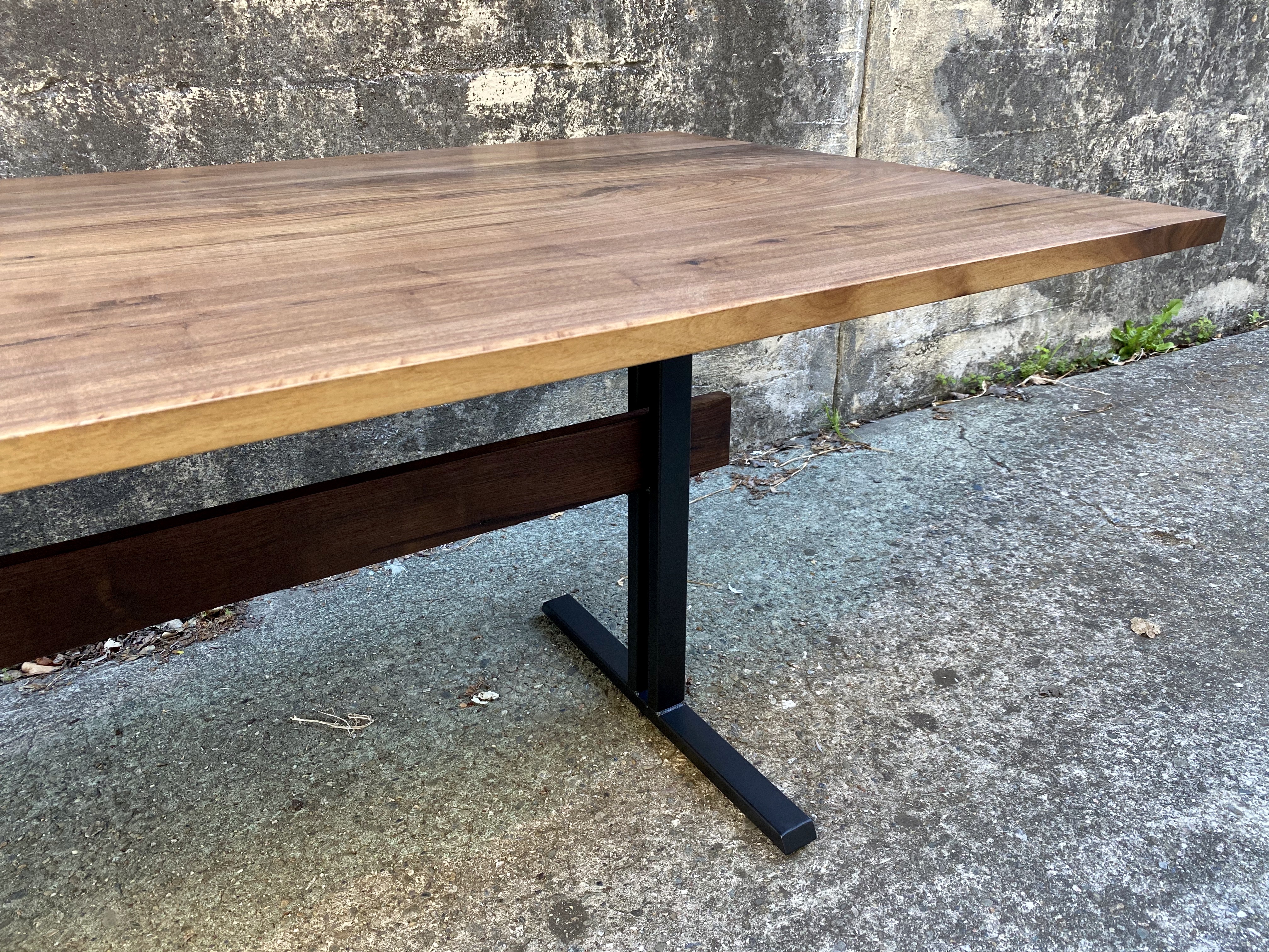 Solid black walnut wood construction. Features dark and medium brown tones, swirling figured movements, and clean edges. Blackened steel legs with matching walnut stretcher underneath. Matte protective commercial grade finish