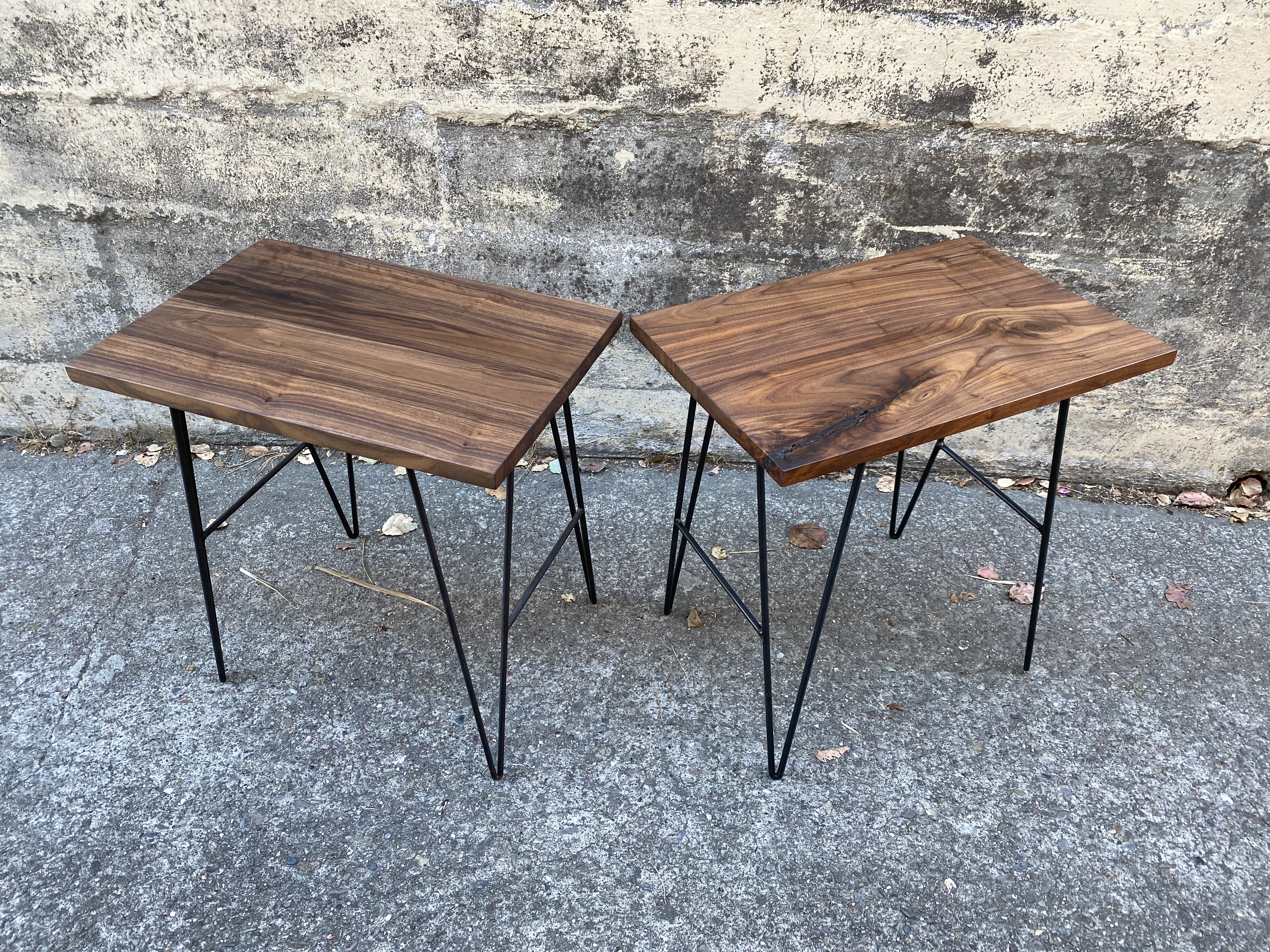 Solid black walnut wood. Swirling dark and medium brown tones. Steel round rod V legs below. Natural hard wax oil finish