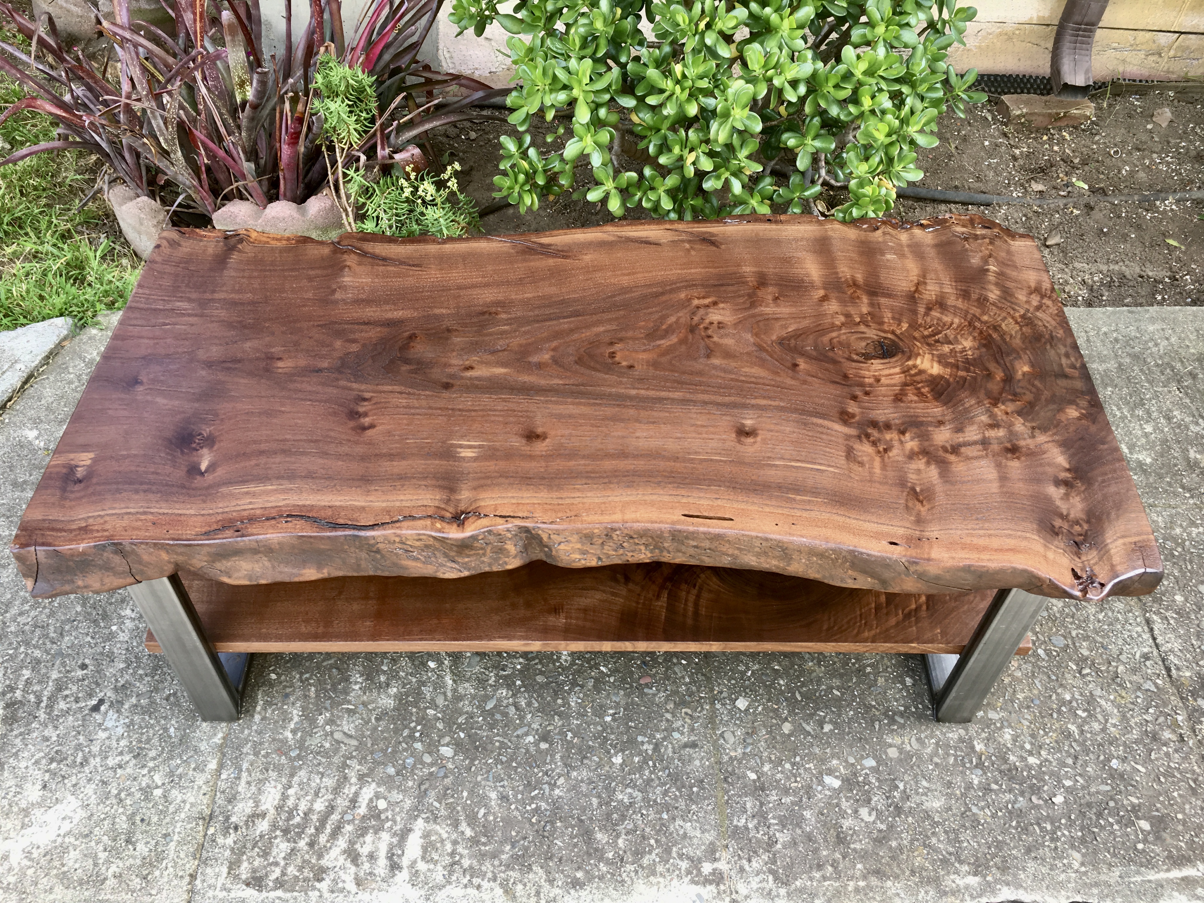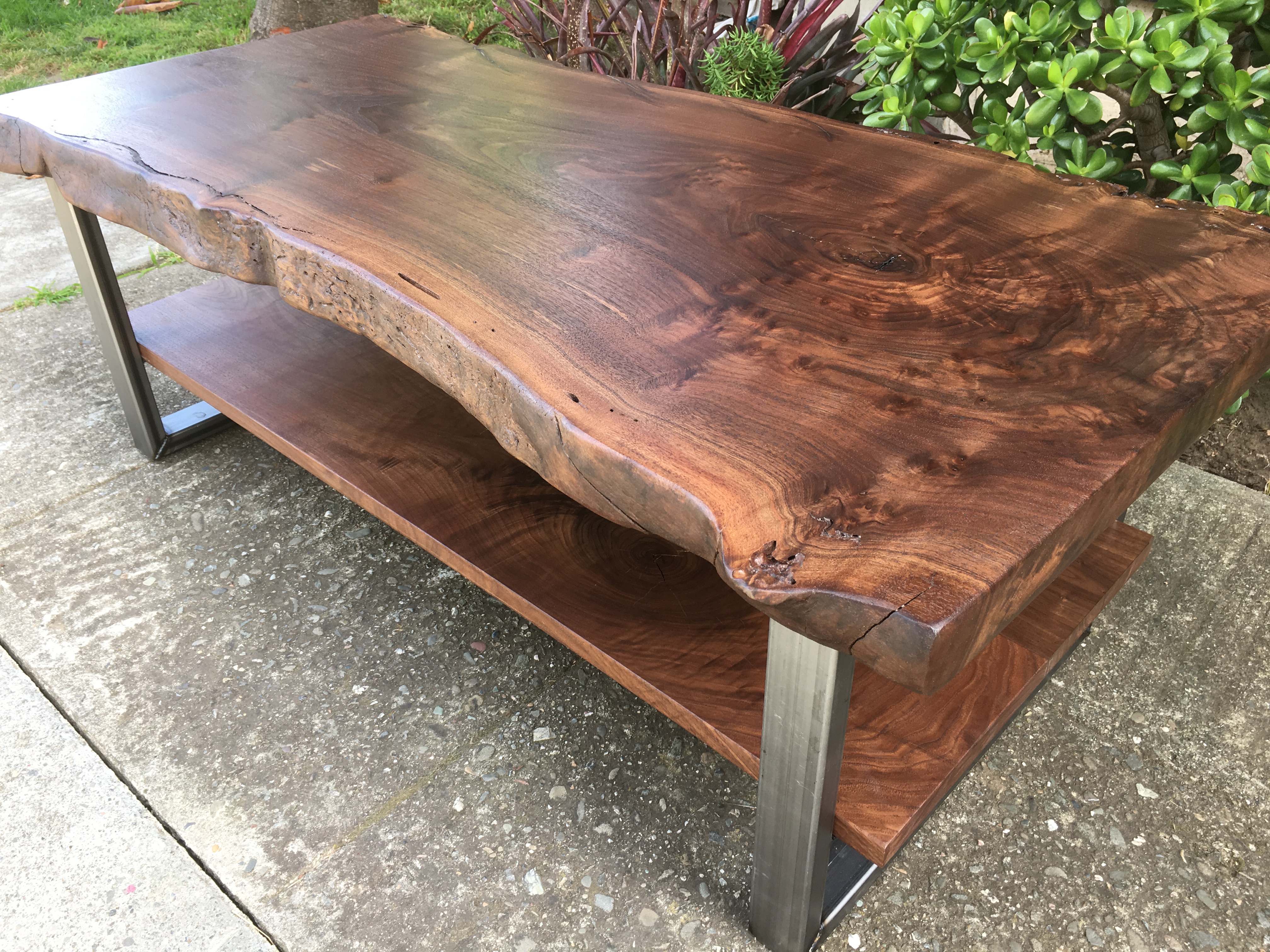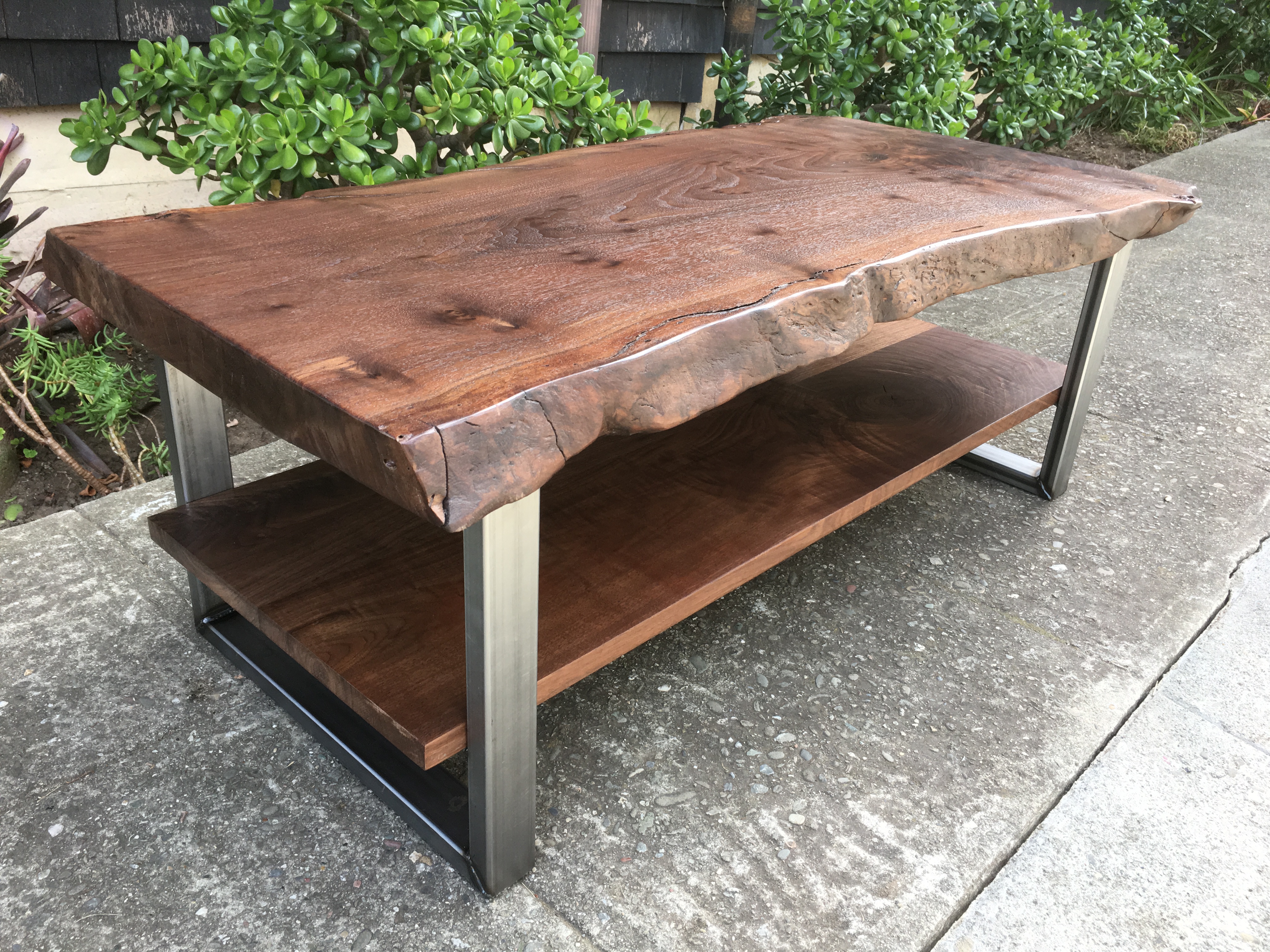 Live edge black walnut slab top. Matching floating black walnut shelf below. Brushed steel box style legs below (black option available). Natural protective hardwax oil finish