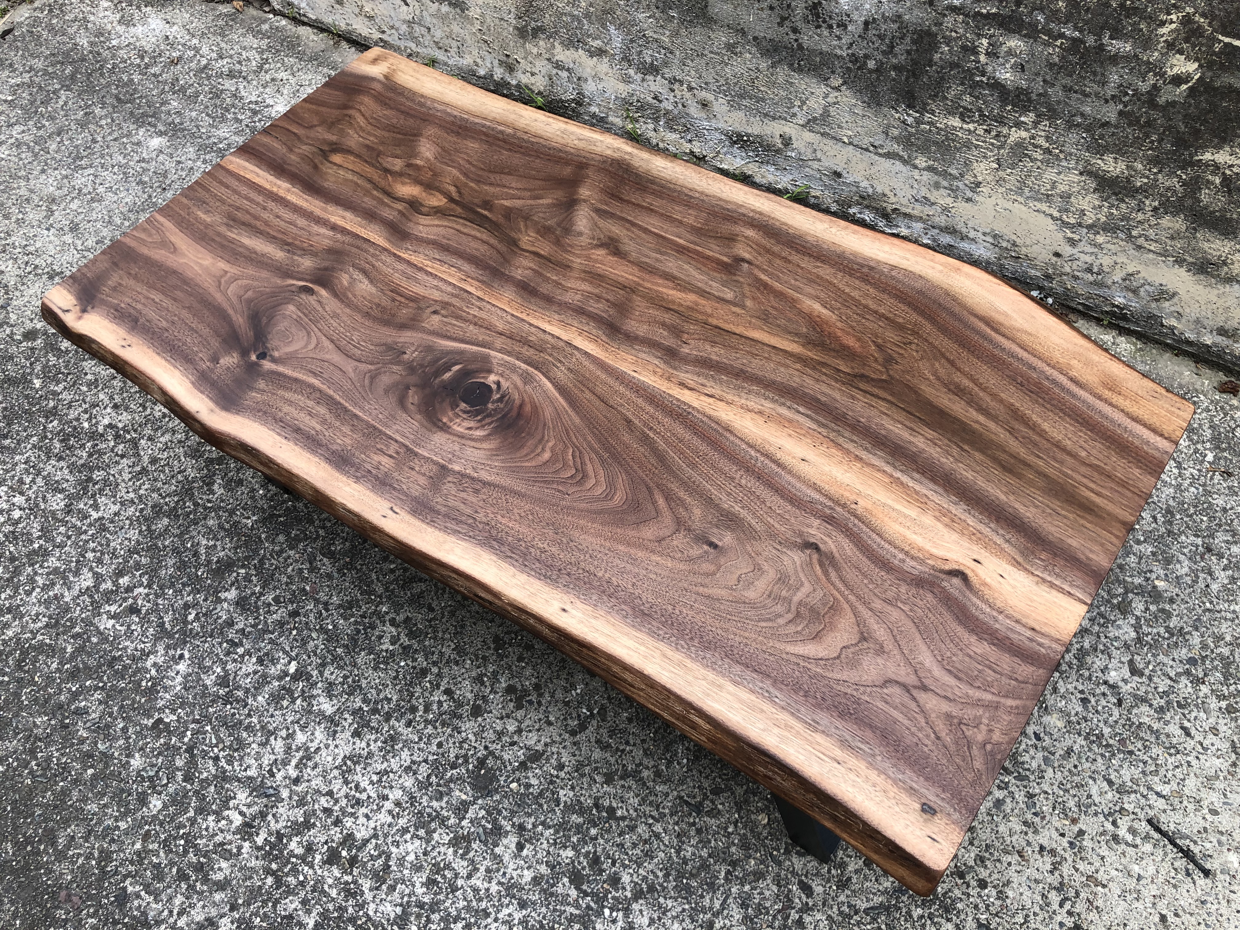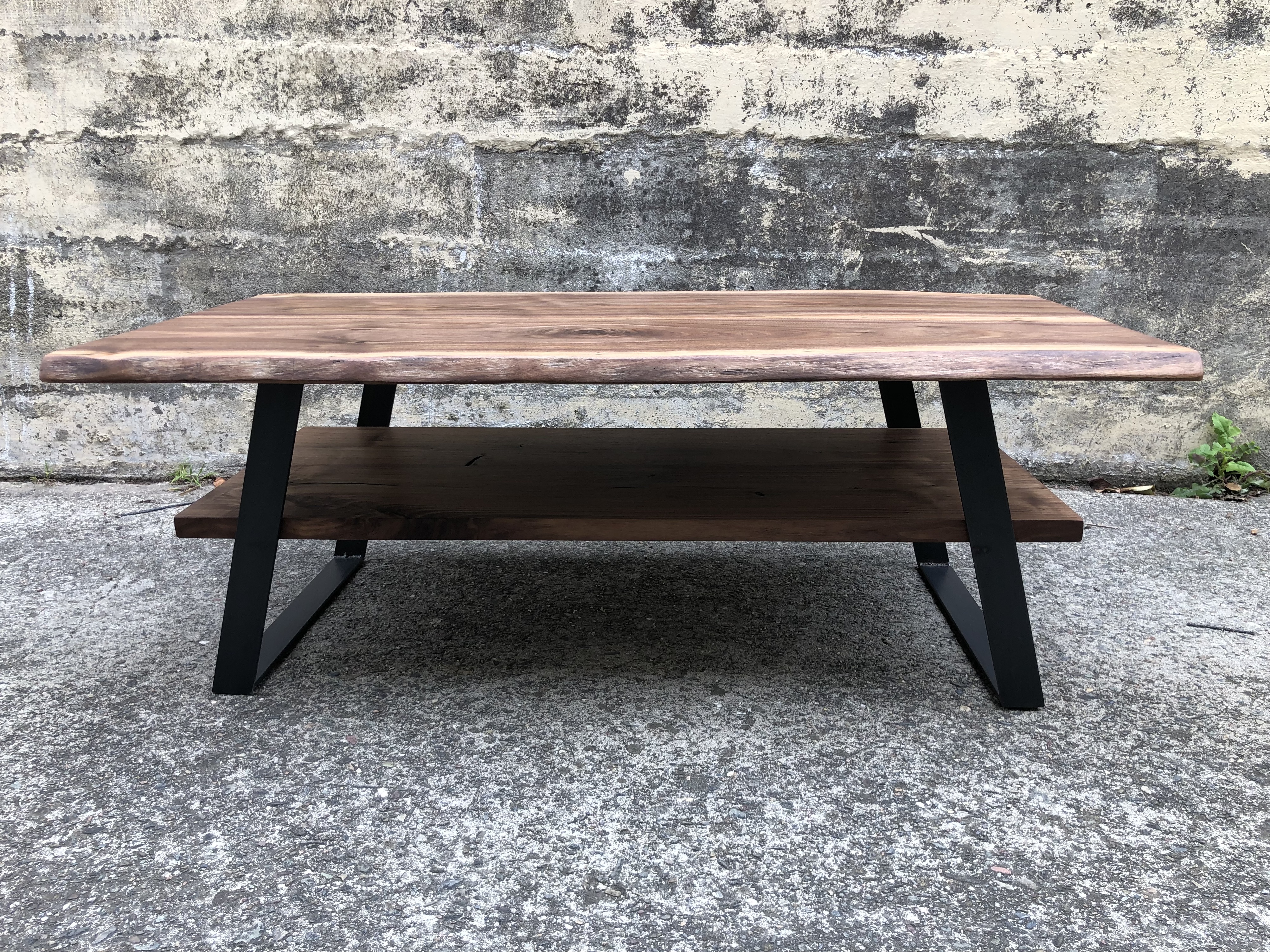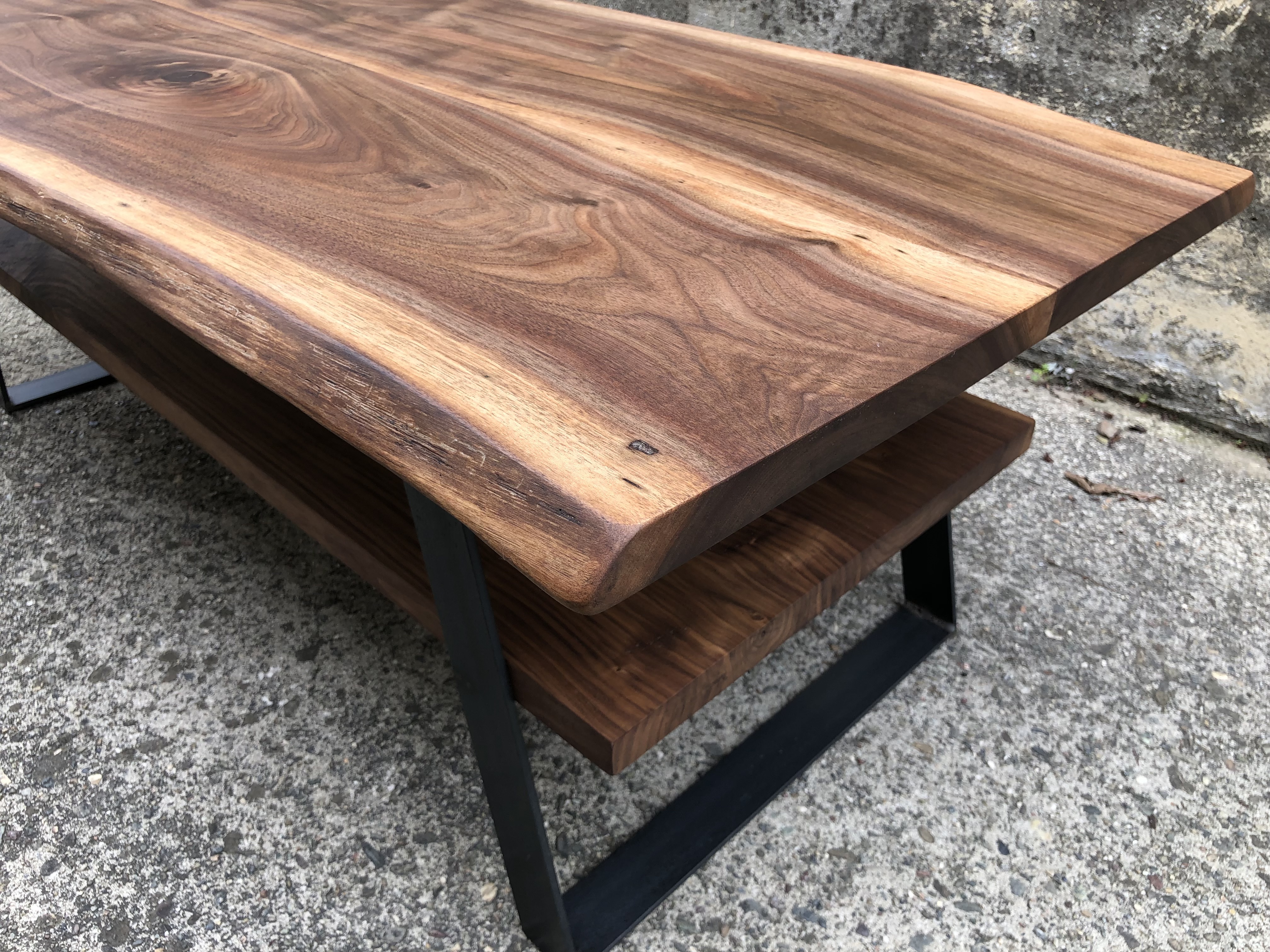 Live edge black walnut top. Matching floating black walnut shelf below. Steel angled flat bar legs. Natural protective hardwax oil finish