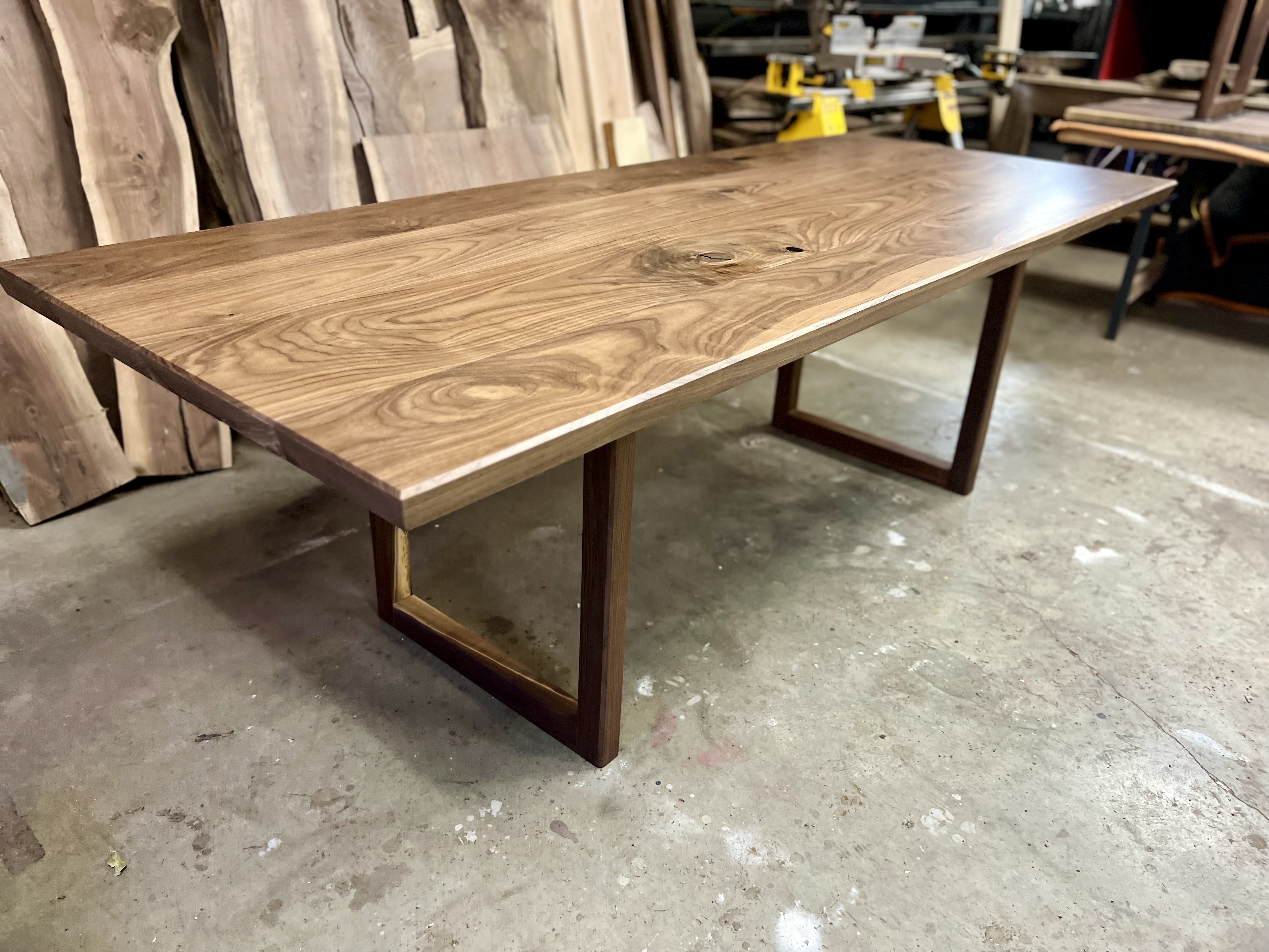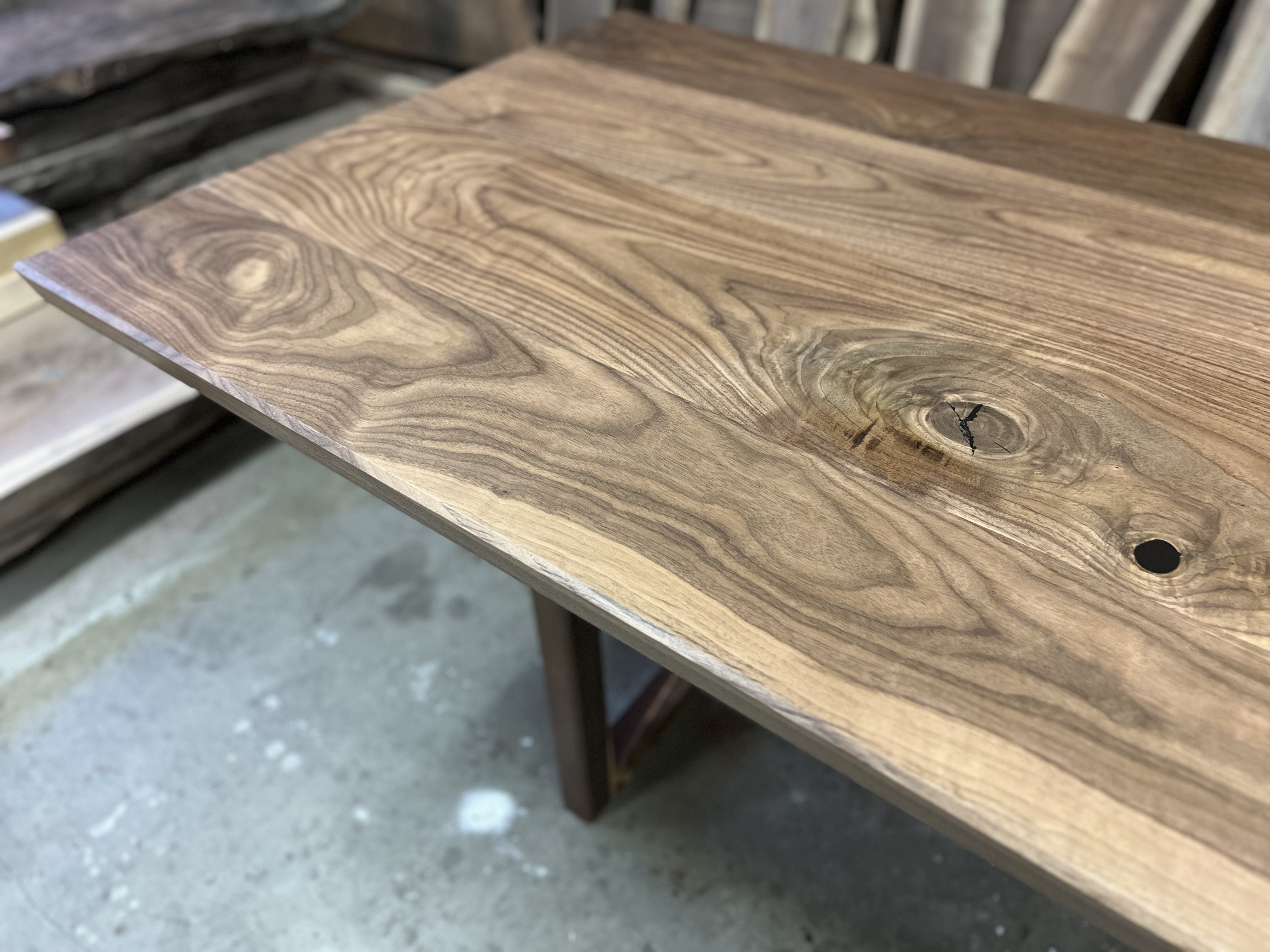 Solid black walnut wood construction. Features dark brown // medium tones, swirling figured grain movements, and diamond edge profile. Matching solid walnut wood legs below. Matte protective commercial grade finish