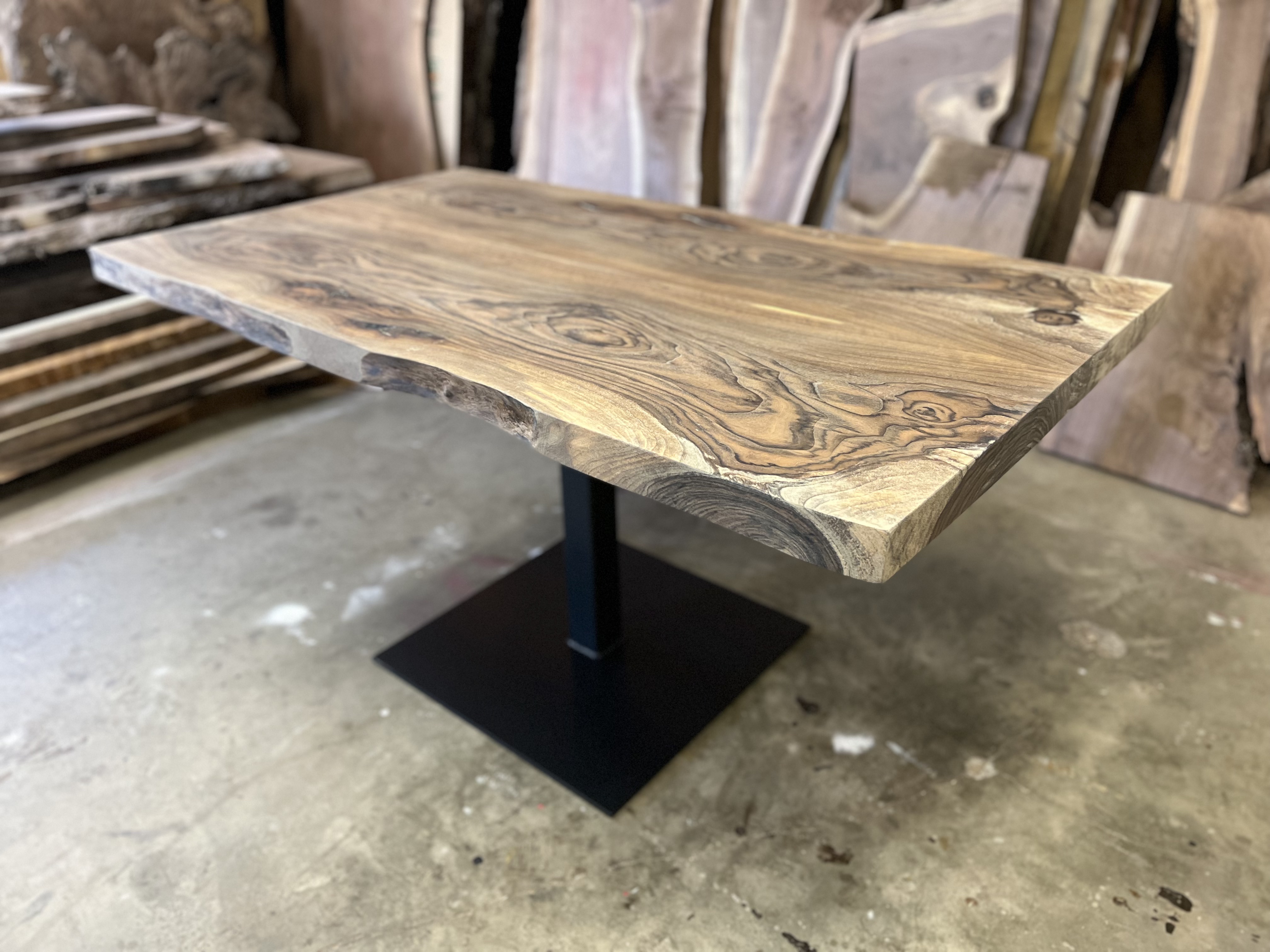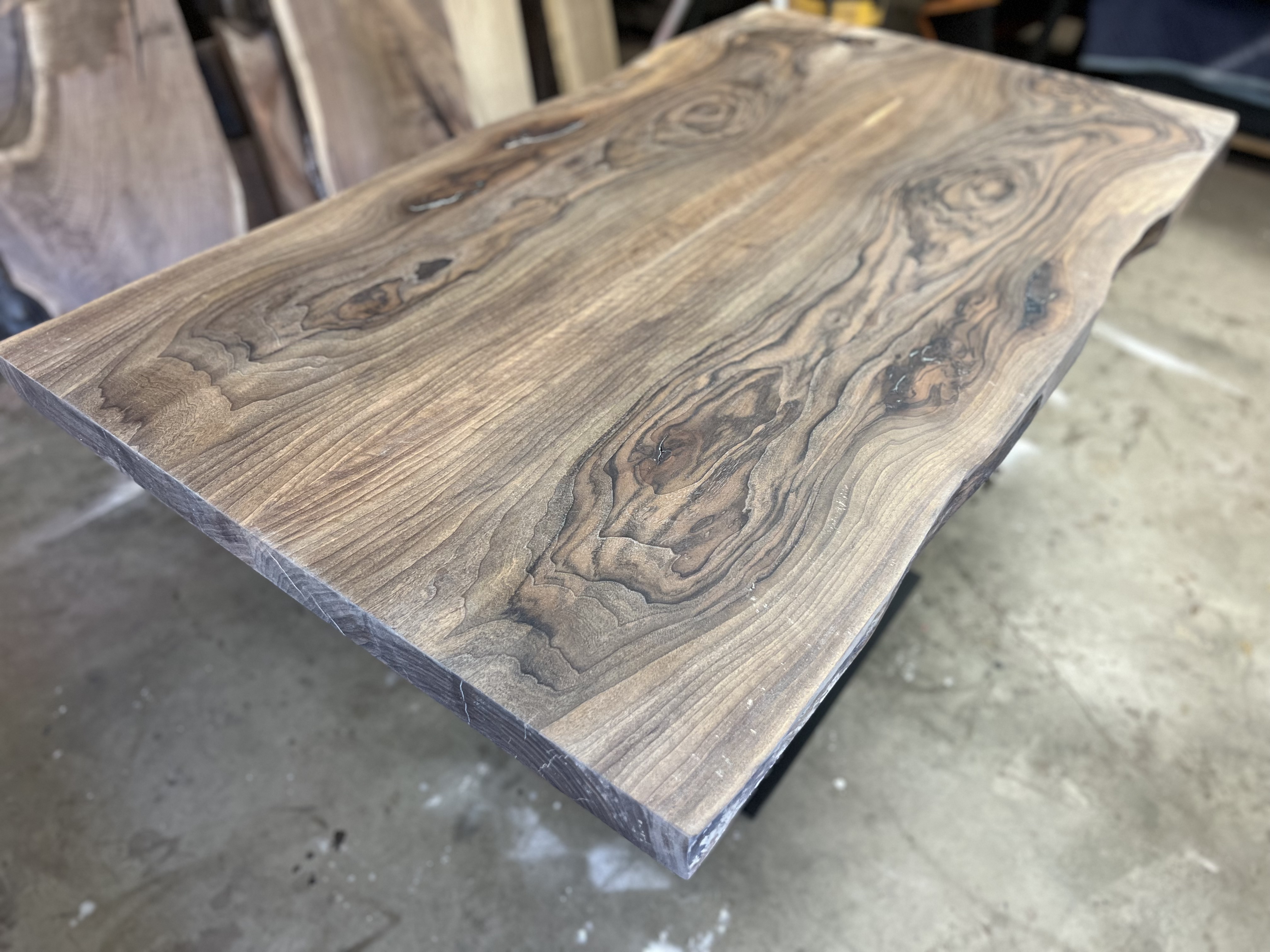 Book-matched sibling English Walnut slabs. Warm grey // brown // cream tones highlight natural grain patterns. Solid black plate and tube steel heavy duty pedestal base below. Natural protective hardwax oil finish
