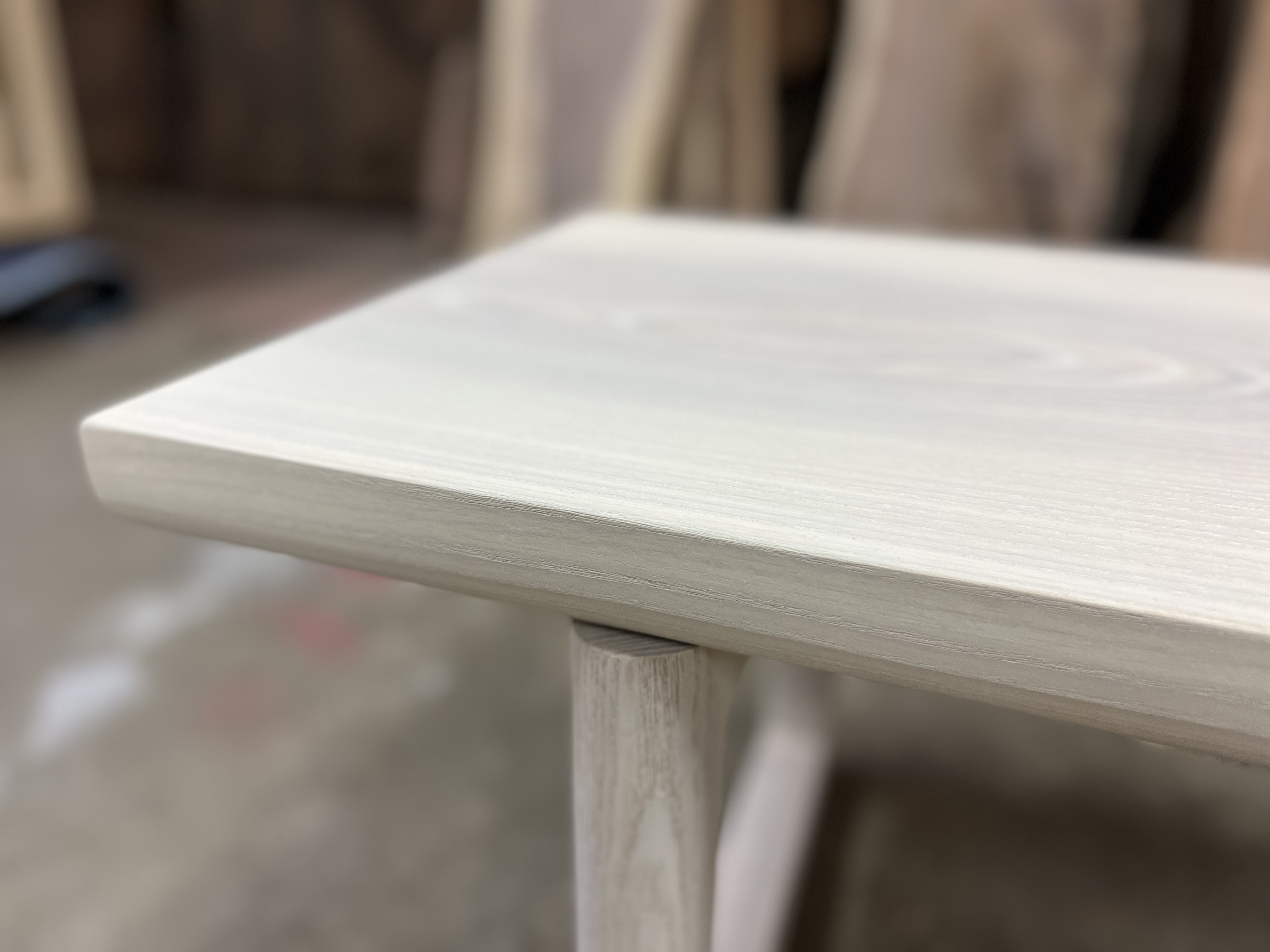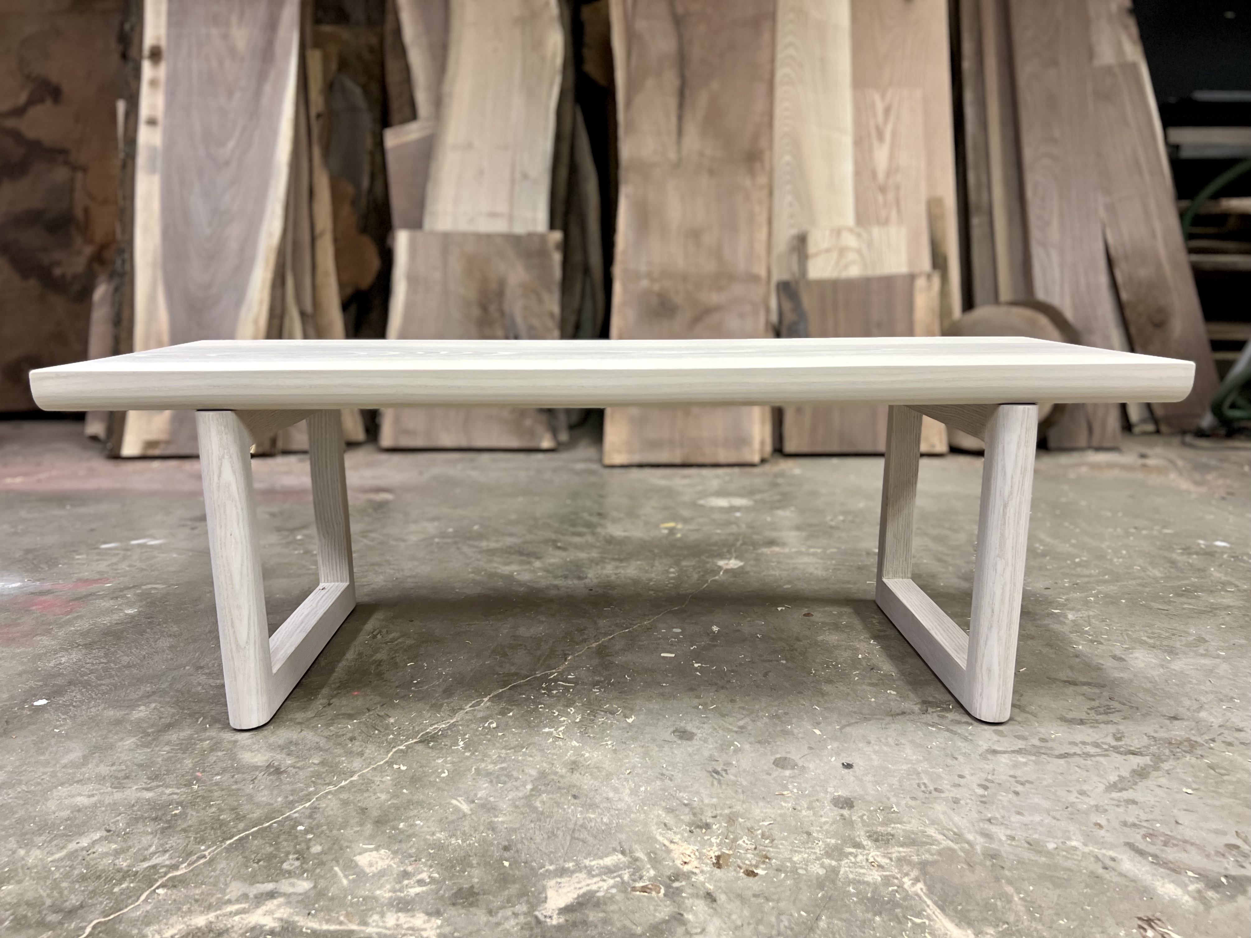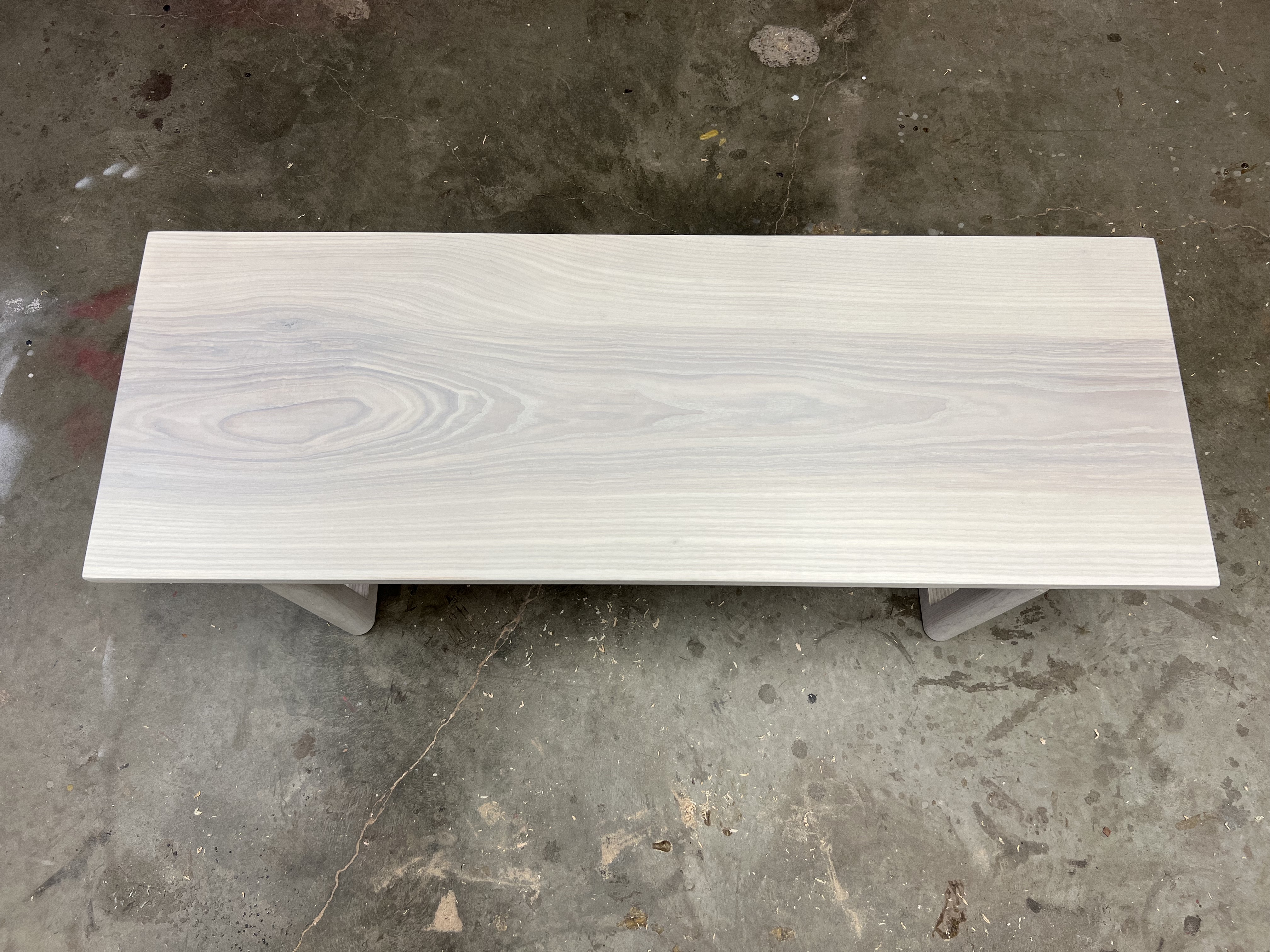 $700A single slab of white ash forms the top of the piece. Useful as a coffee table or bench. XL rounded profile on undersides and legs. Cathedral like white // grey grain patterns within. Solid matching wood legs below. Natural hard wax oil finish