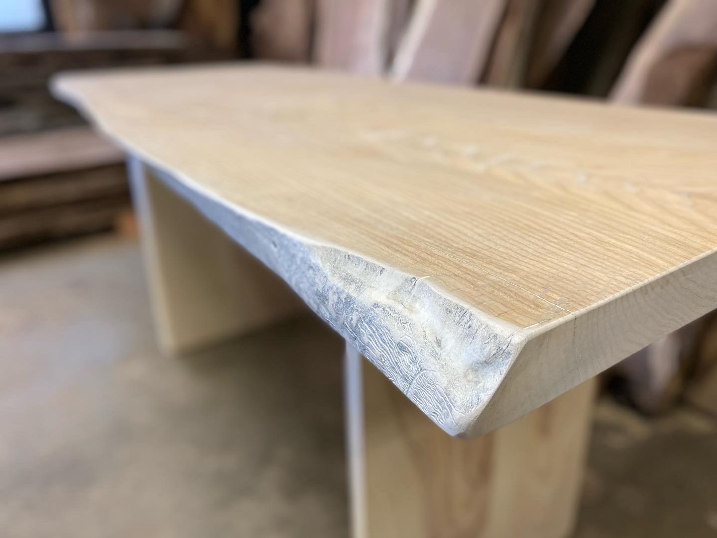 A single slab of ash comprises the top of this desk // dining table. Live edges on both sides. Flowing light golden tones throughout. Solid matching wood legs below. Natural hard wax oil finish